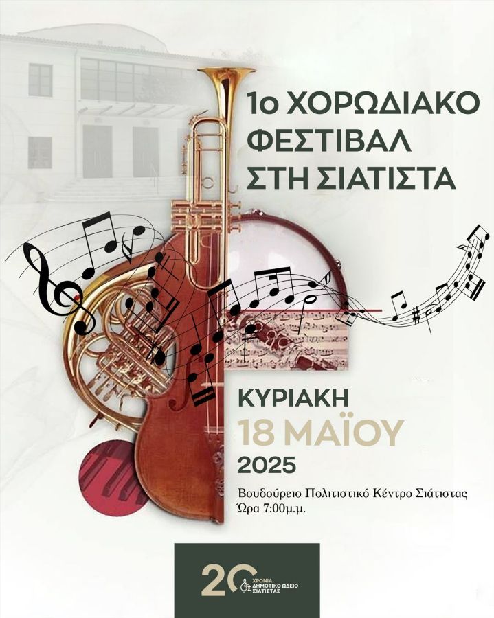 Ο Δήμος Βοΐου στο πλαίσιο των εορτασμών των 20 χρόνων από την ίδρυση του Δημοτικού Ωδείου Σιάτιστας διοργανώνει την Κυριακή 18 Μαΐου 2025 στις 19:00 στο Πολιτιστικό Κέντρο Σιάτιστας «Άρης και Λίλιαν Βουδούρη» το 1ο Χορωδιακό Φεστιβάλ Σιάτιστας