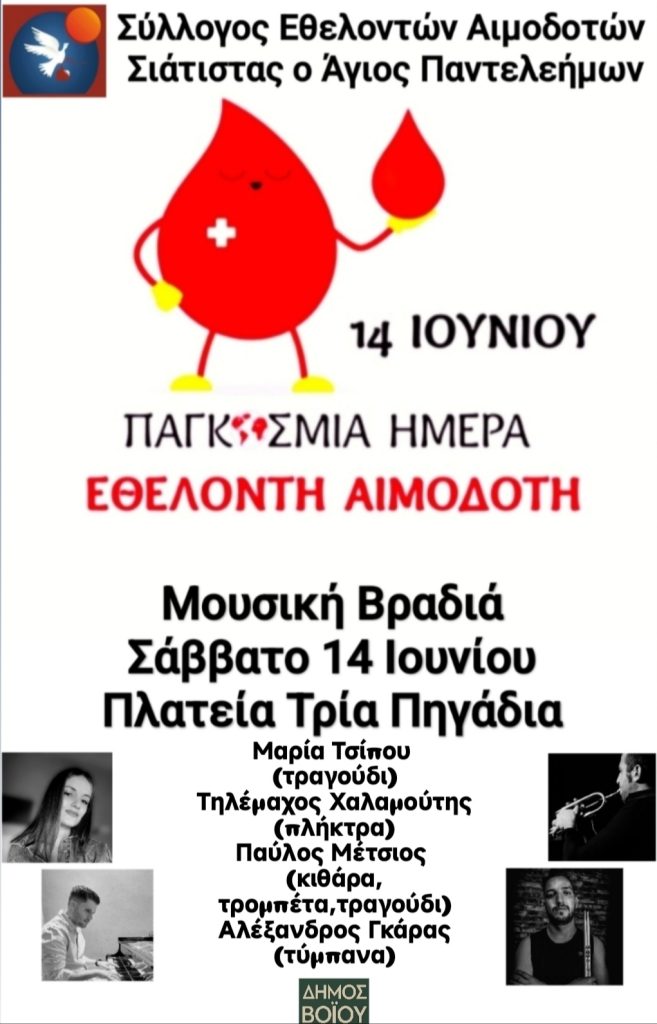 Ο Σύλλογος Εθελοντών Αιμοδοτών Σιάτιστας ο Άγιος Παντελεήμων διοργανώνει Μουσική εκδήλωση για την Παγκόσμια Ημέρα Εθελοντή Αιμοδότη, το Σάββατο 14 Ιουνίου 2025, στις 9.00 στην Πλατεία Τρία Πηγάδια, στη Σιάτιστα.